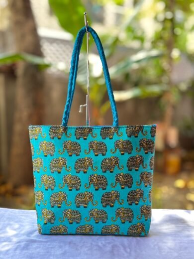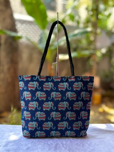 Candy Tote Bag – Hand Block Printed Fabric with Elephant Motif (12″ x 15″ | Bottom 3″)