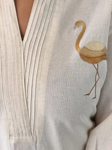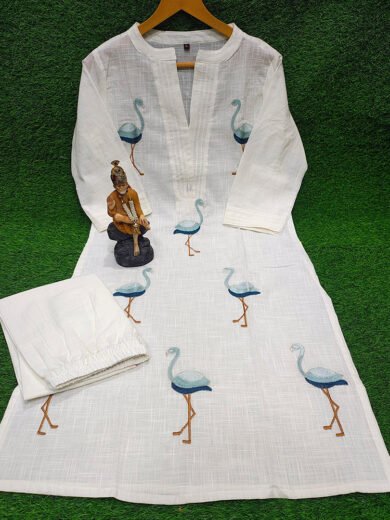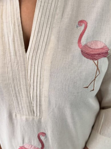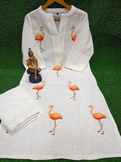 Ivory Cotton Kurta Set with Pink Flamingo Thread Embroidery