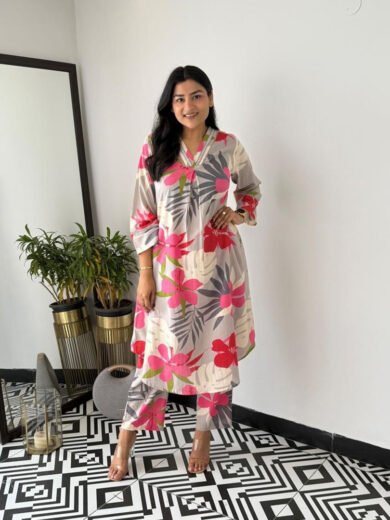 Tropical Bloom Cotton Co-ord Set – Floral Printed A-Line Kurta Set for Women