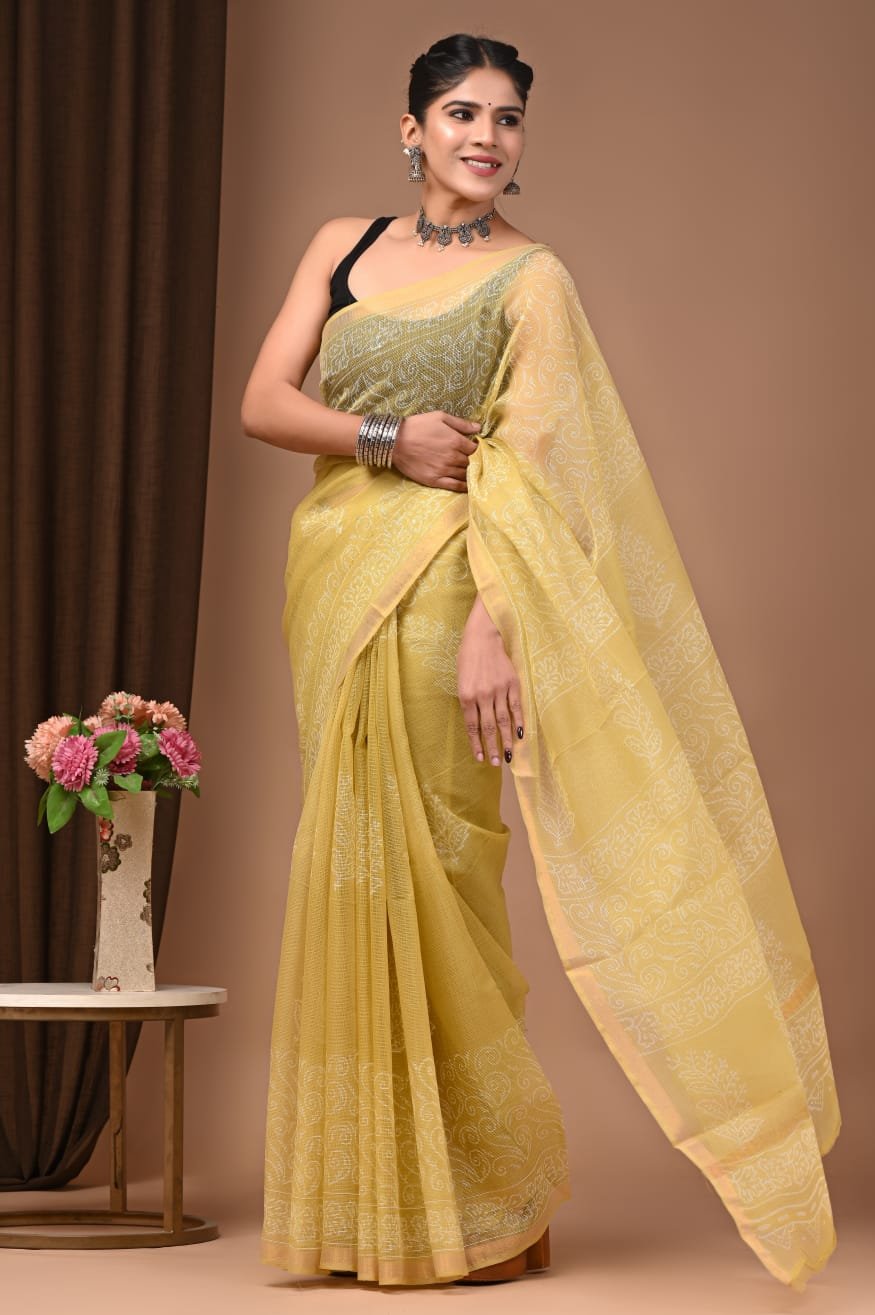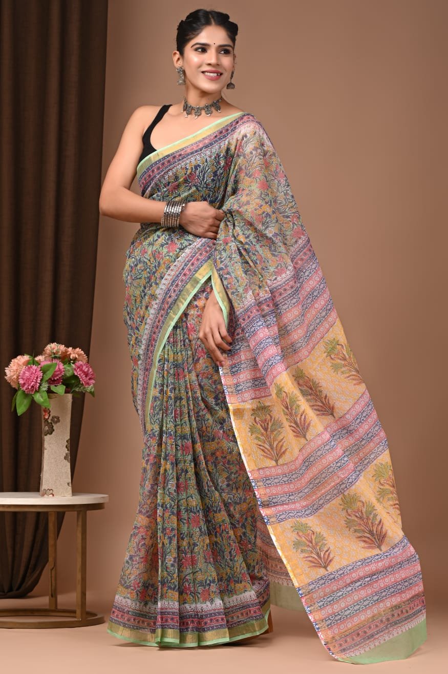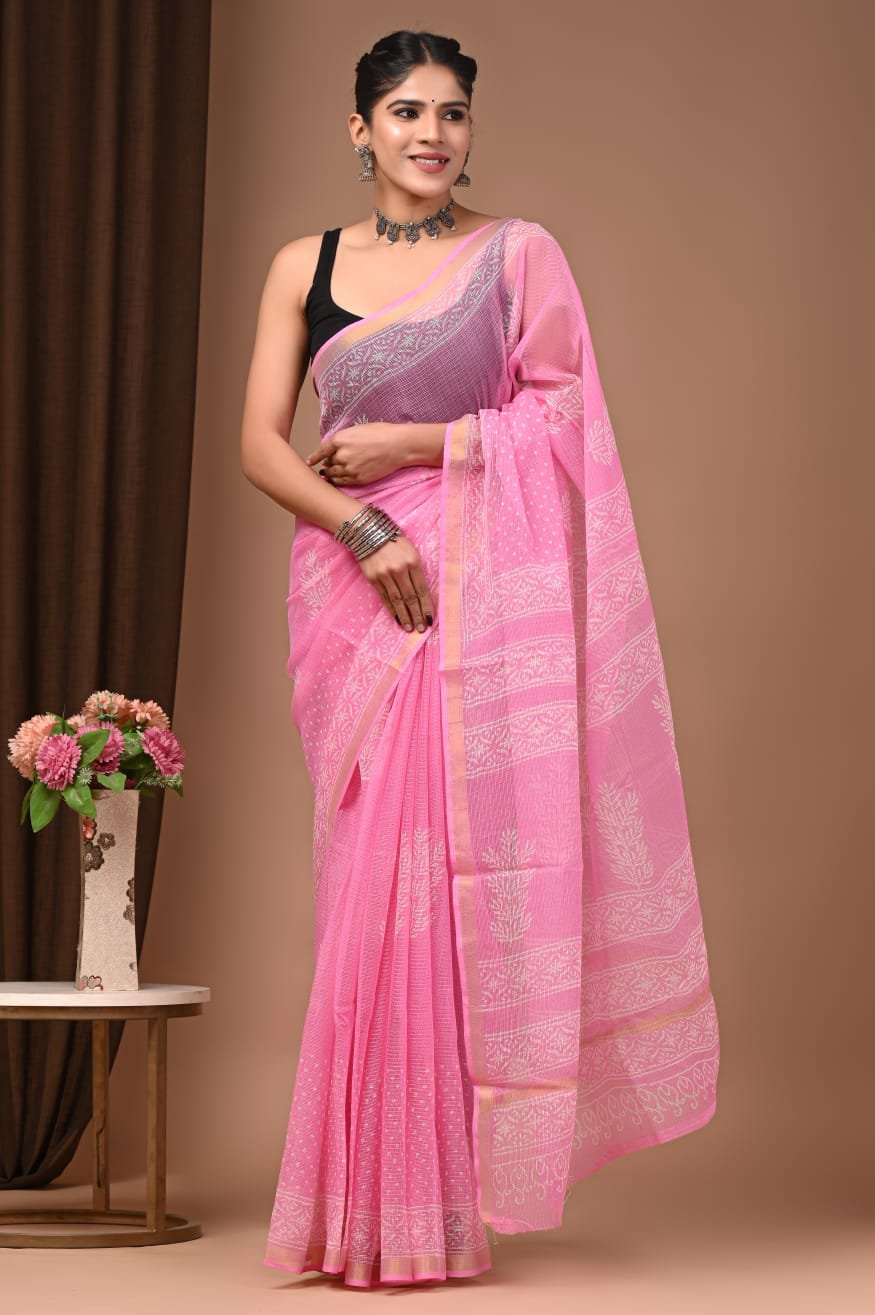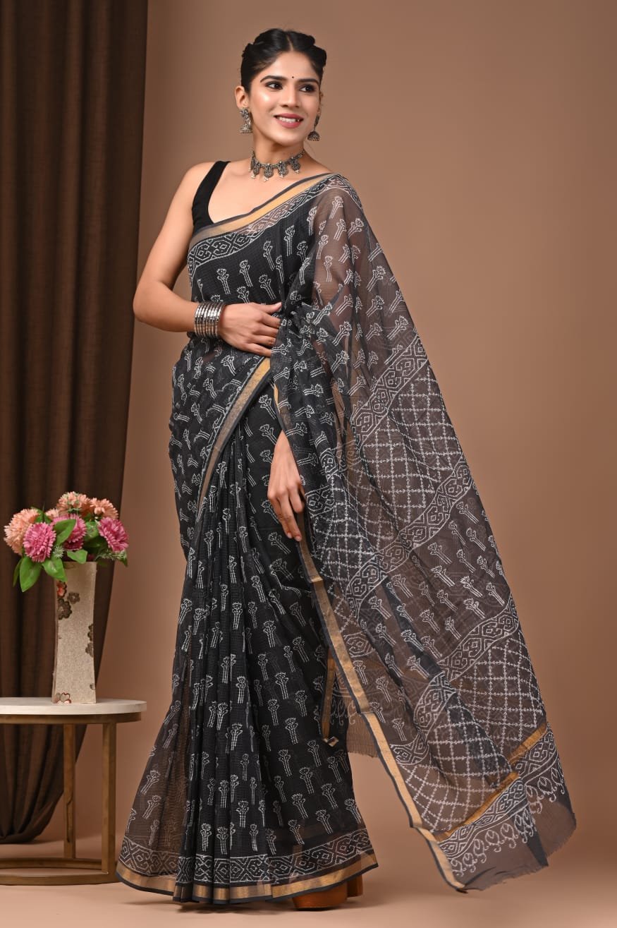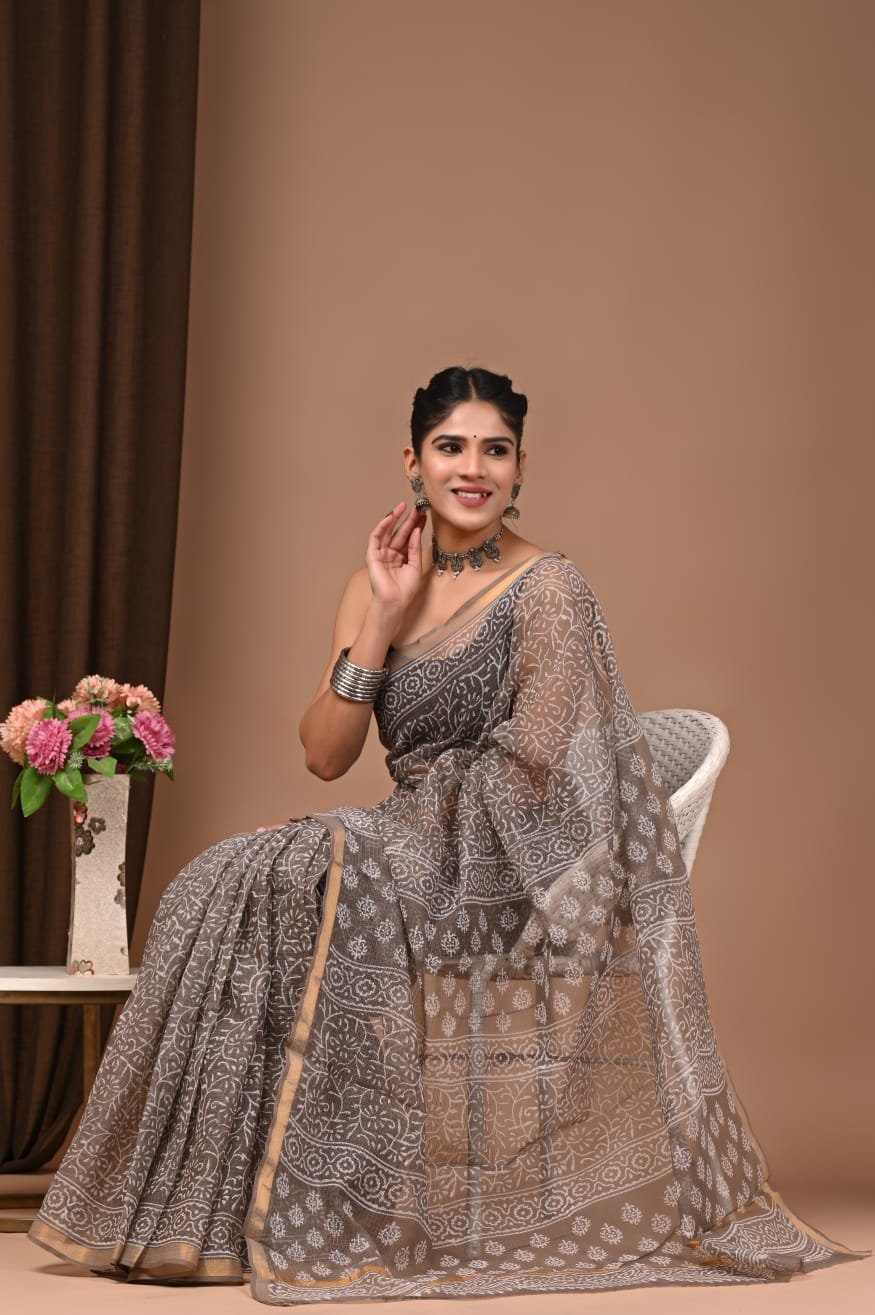 This exquisite Kota Doriya saree is a part of the new Bagru print collection, combining traditional Indian craftsmanship with contemporary elegance. Made from lightweight and breathable Kota Doriya fabric, it offers a graceful drape and comfortable wear, making it ideal for both festive occasions and casual gatherings.
