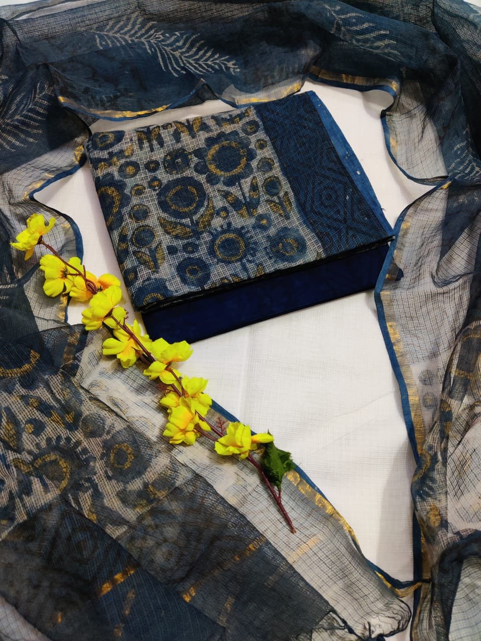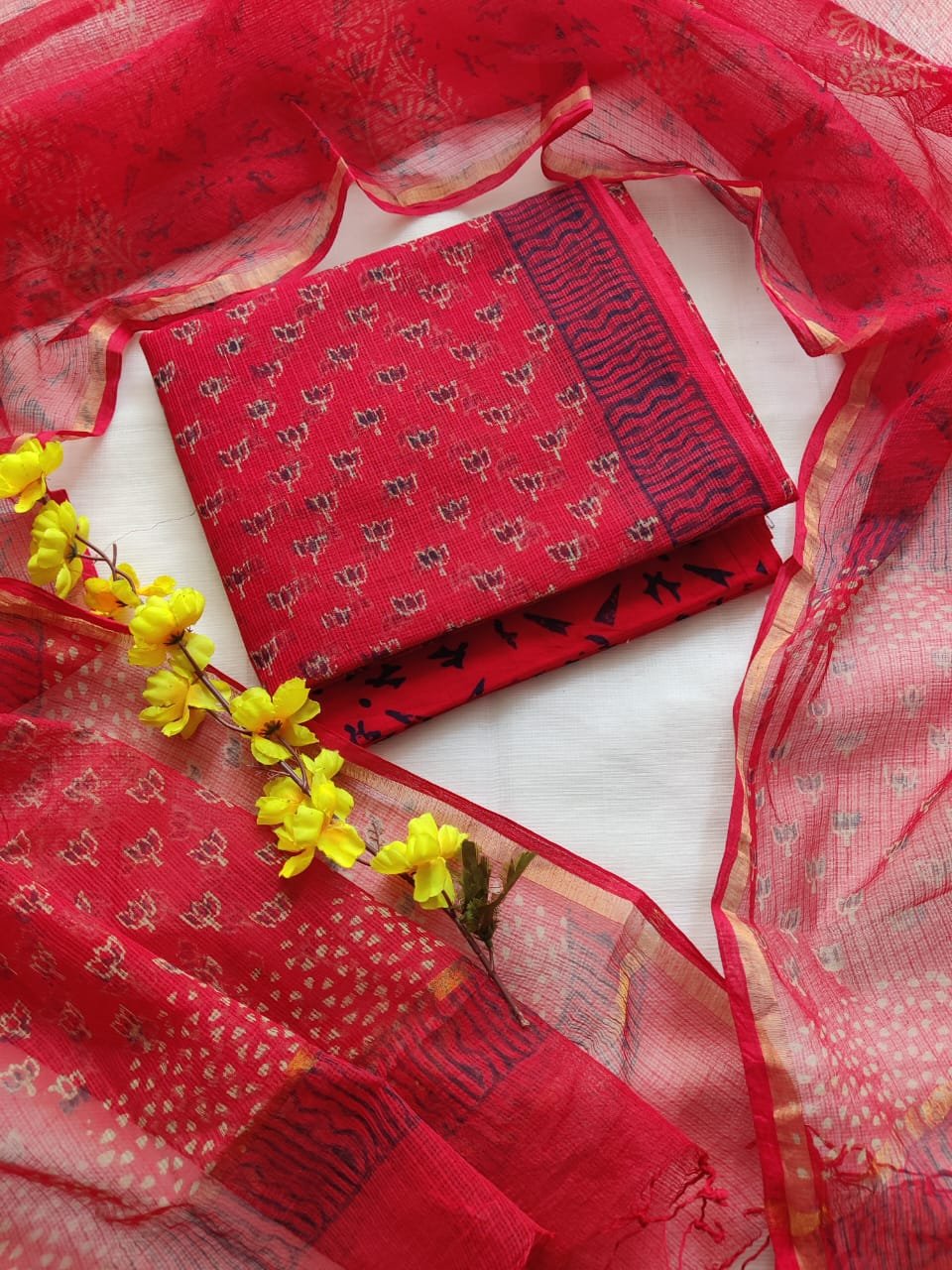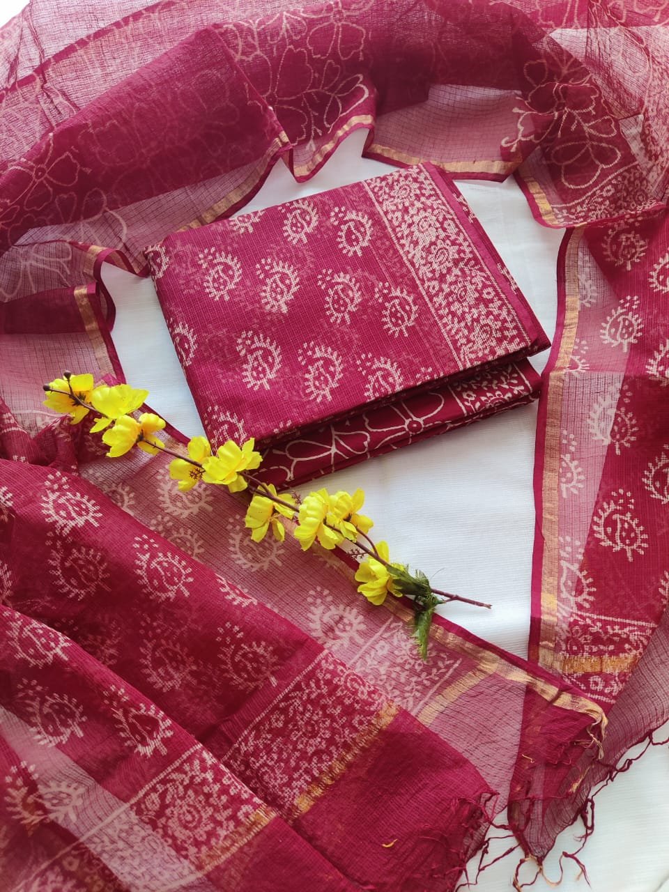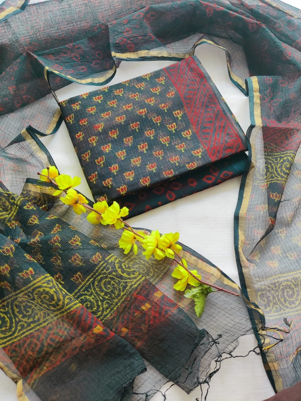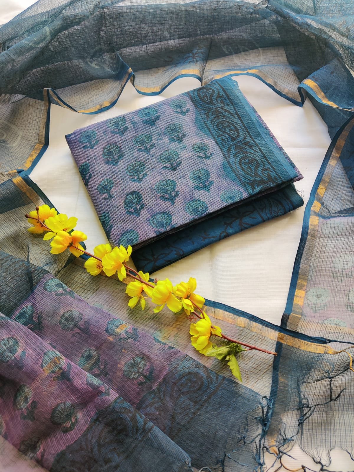 Suit (Top): Hand block printed Kota Doriya fabric with a light, airy texture and elegant traditional appeal; length 2.5 meters.