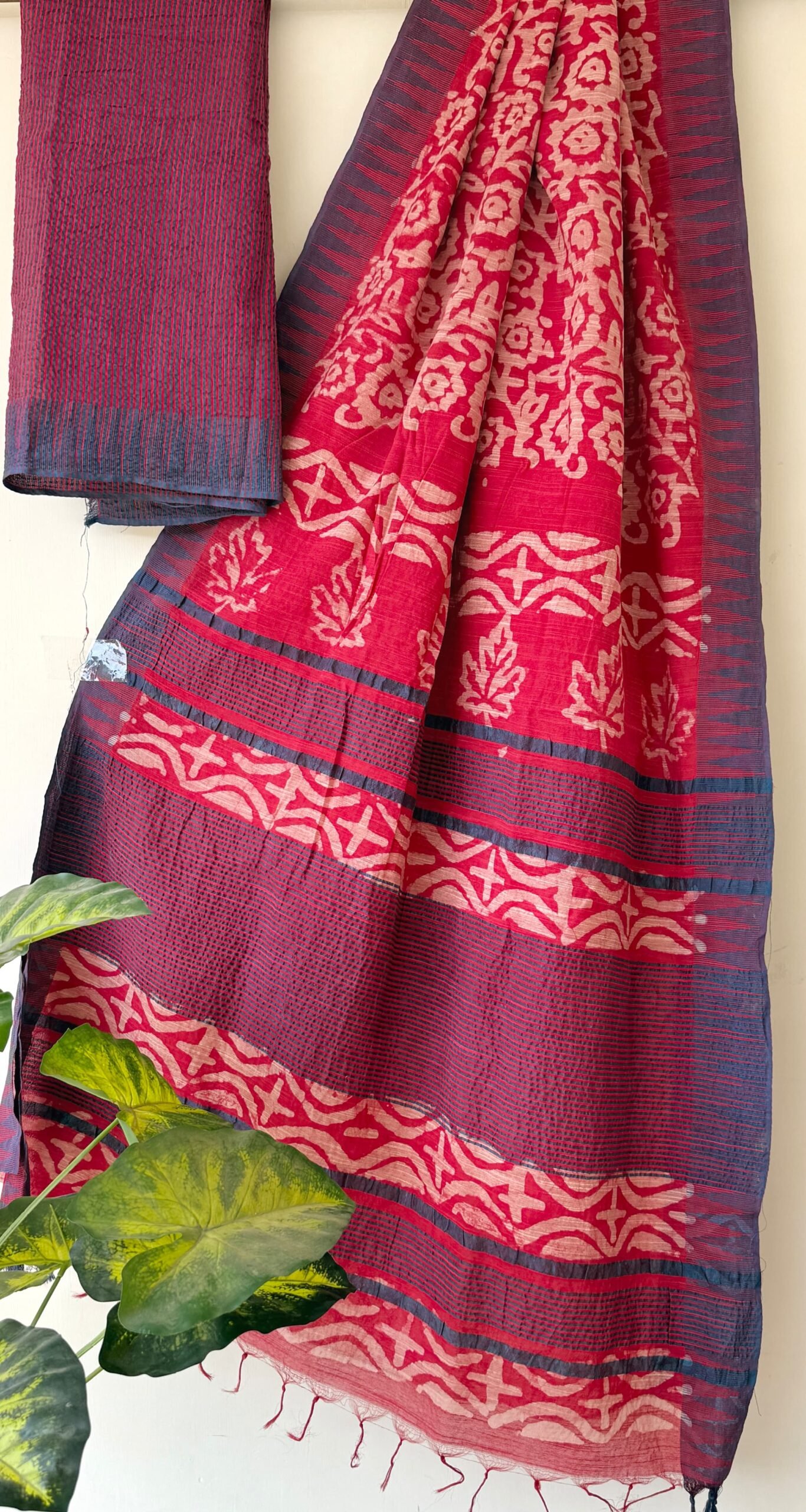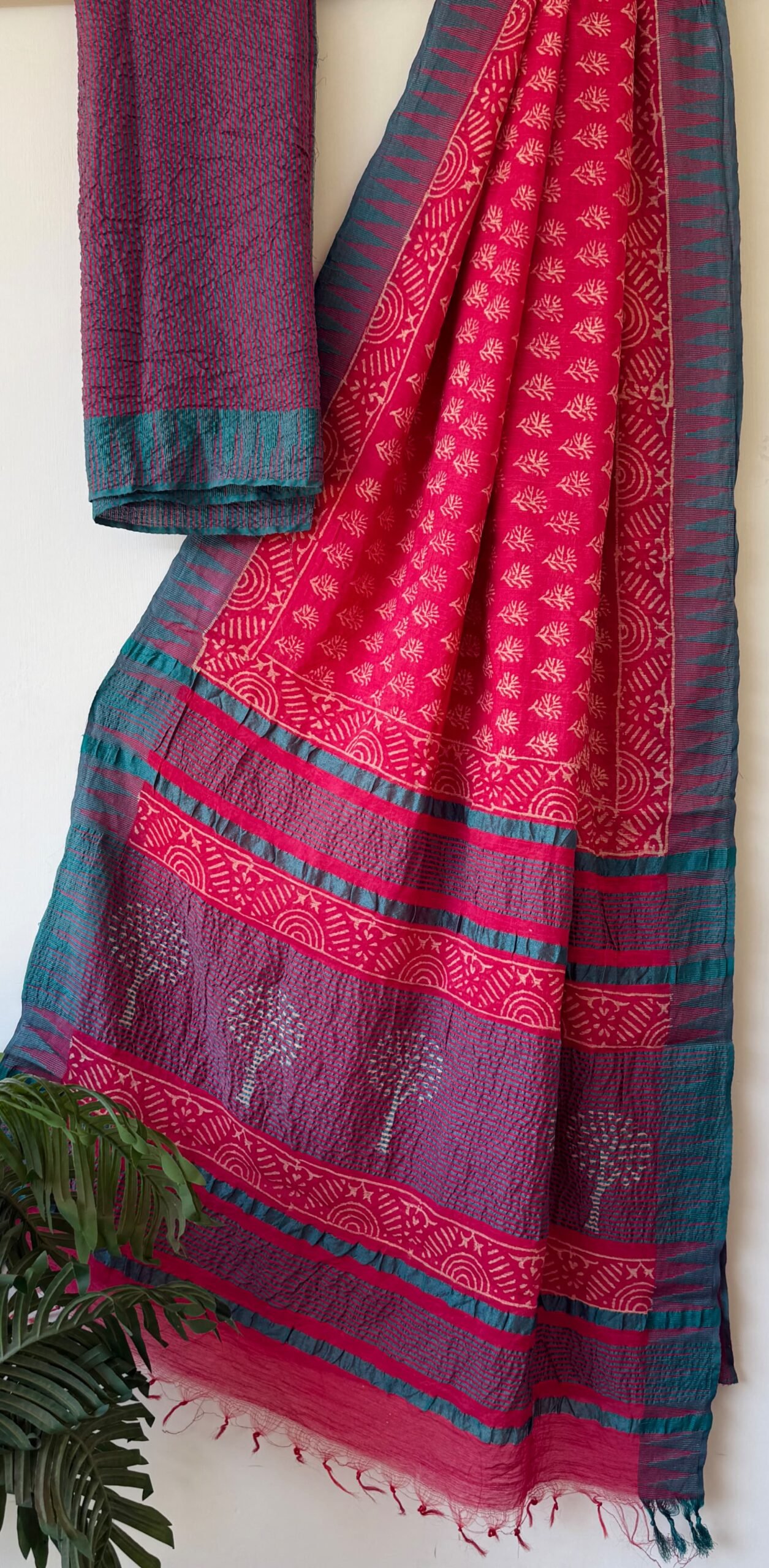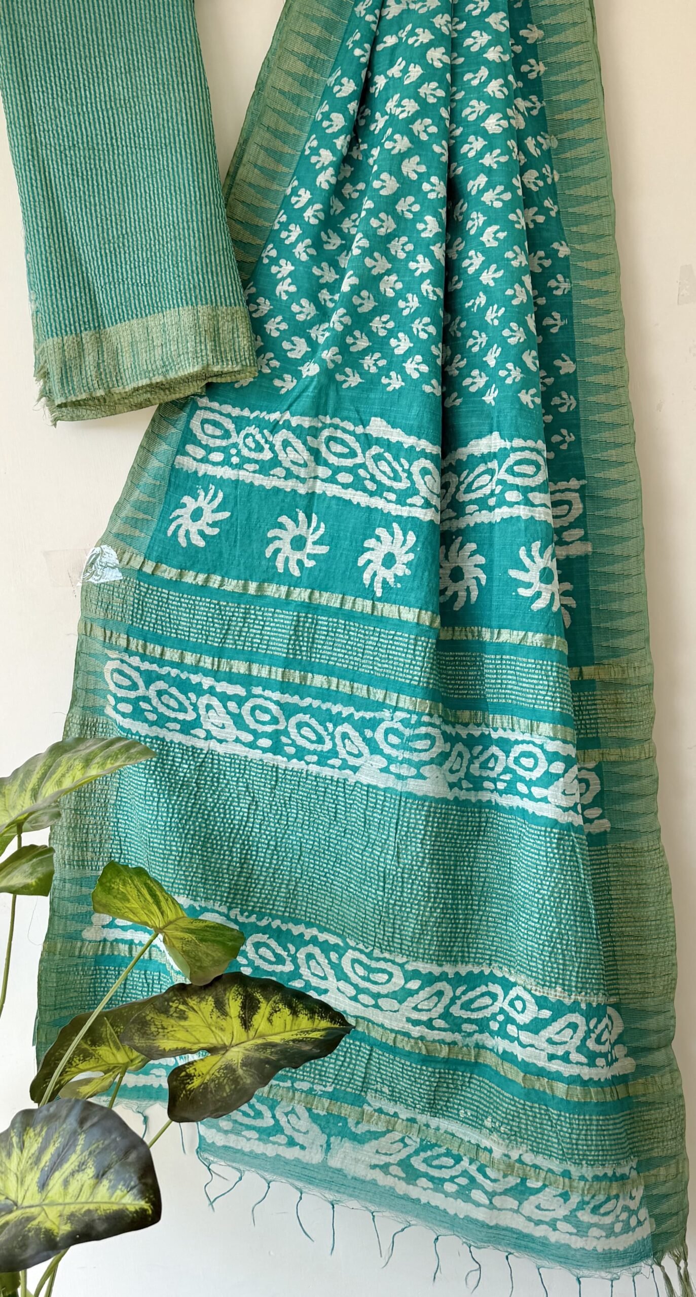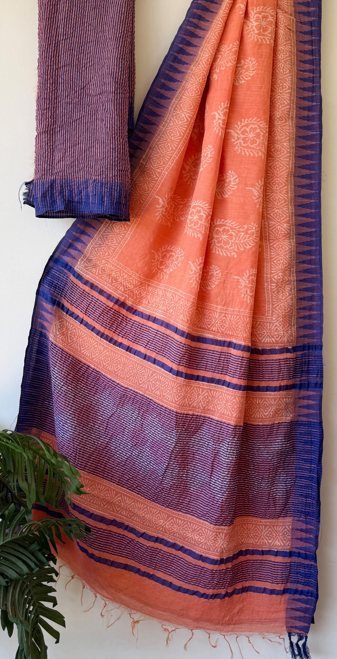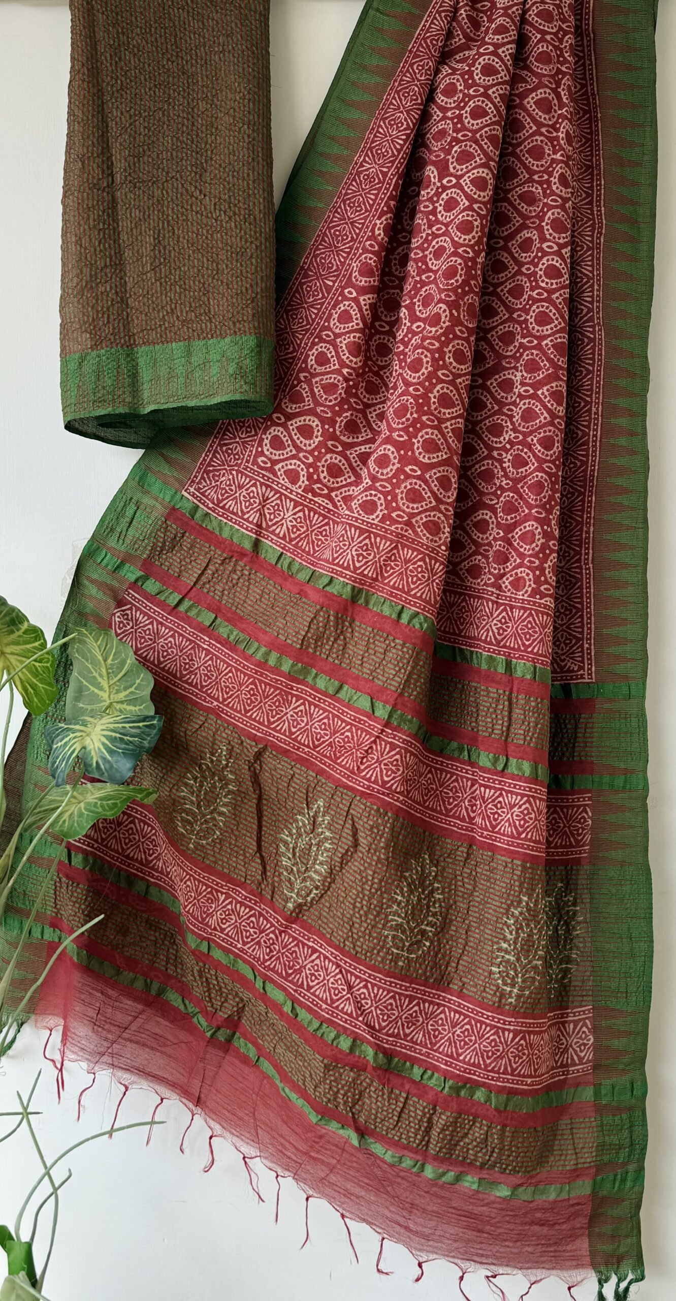 Exclusive hand block printed cotton silk with temple border sarees (Ajarak and Dabu prints) with blouse.