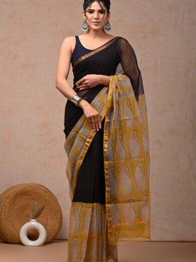 Bagru Handblock Maheshwari Silk Saree – Yellow & Black with Paisley Border (5.5m + 1m Blouse)