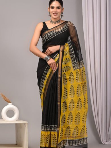 Bagru Handblock Print Maheshwari Silk Saree – Yellow & Black with Zari Border (5.5m + 1m Blouse)